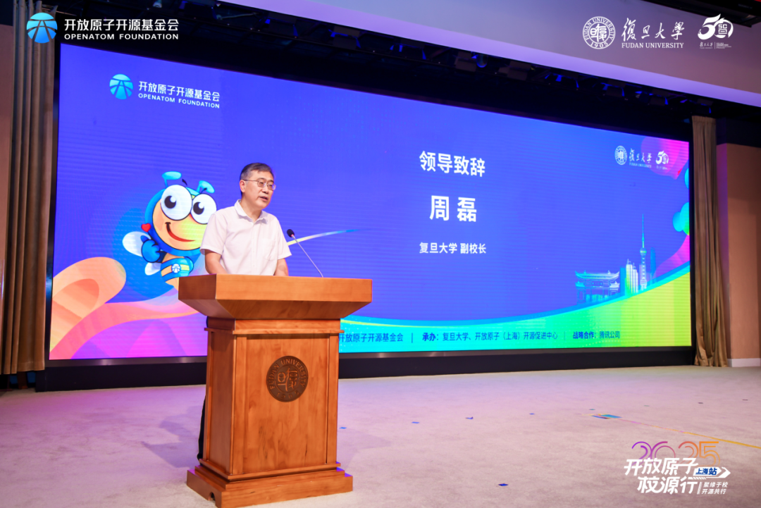 周磊在致辞中表示,复旦大学始终以服务国家战略需求为己任,在开源领域积极探索“校-企-社”协同育人模式。近年来,学校通过学术成果开源开放、专业课程实践融合、开放原子开源社团建设、“开源先锋激励计划”设立等举措,推动学生从“使用开源”向“贡献开源”转变,未来将进一步深化与各方合作,打造开源理念传播“桥头堡”与人才成长“孵化器”。