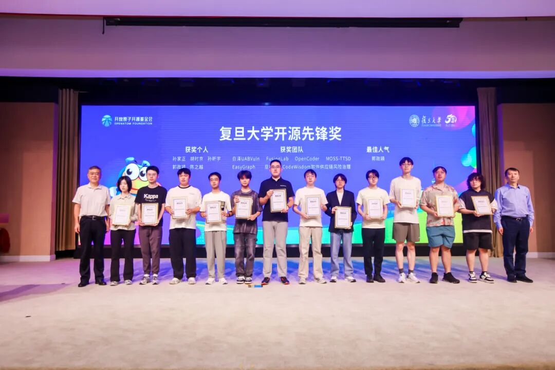 活动同期,复旦大学联合开放原子开源基金会发起首届“复旦大学开源先锋奖励计划”。该计划吸引了来自复旦大学计算与智能创新学院、临床医学院、生命科学院、集成电路与微纳电子创新学院、国际关系与公共事务学院等多个院系的本科及研究生申报,包括16名个人和10支团队。经过专家评审,胡时京、孙昕宇等5名学生,MOSS-TTSD、OpenCoder、旦挞等7个团队斩获“复旦大学开源先锋奖”。